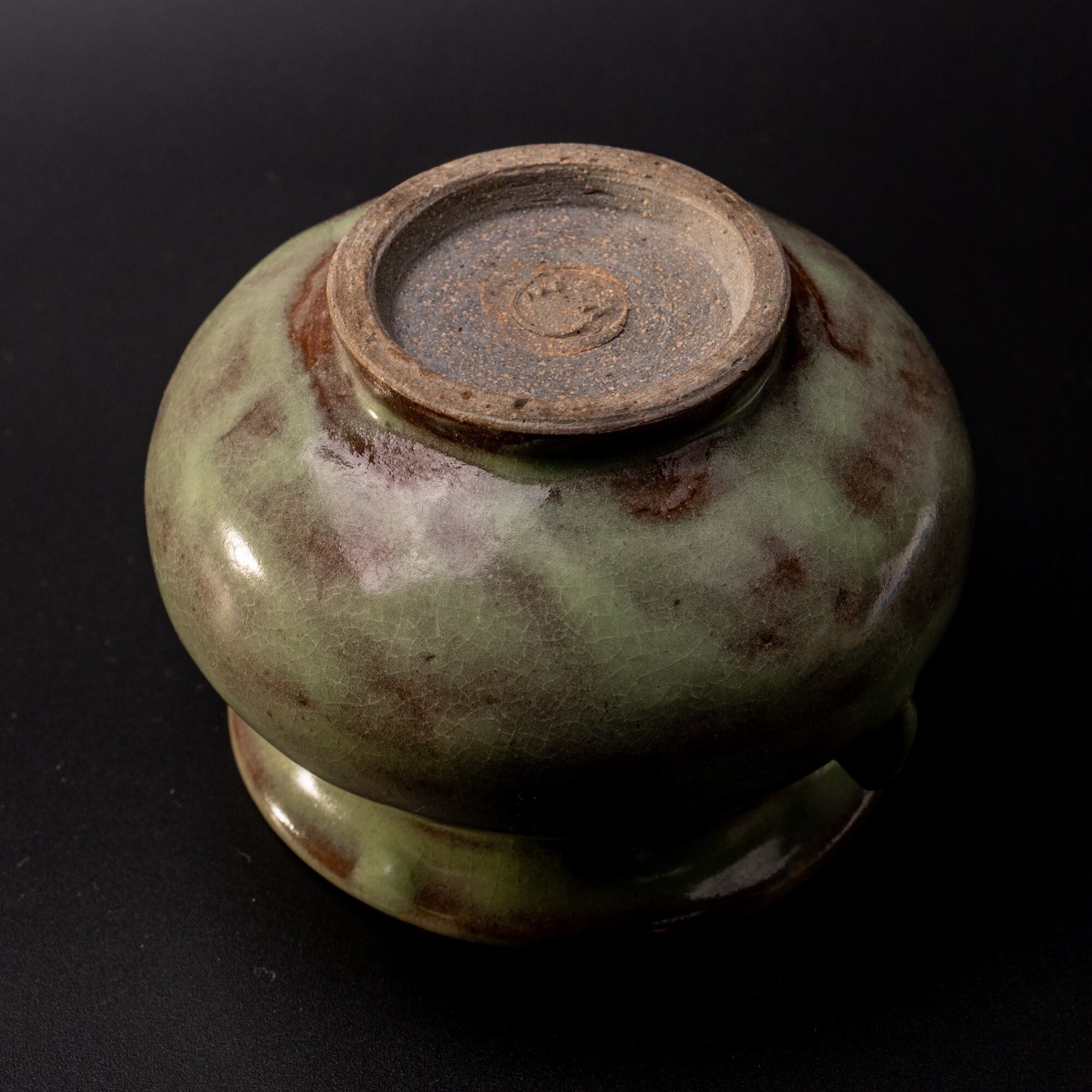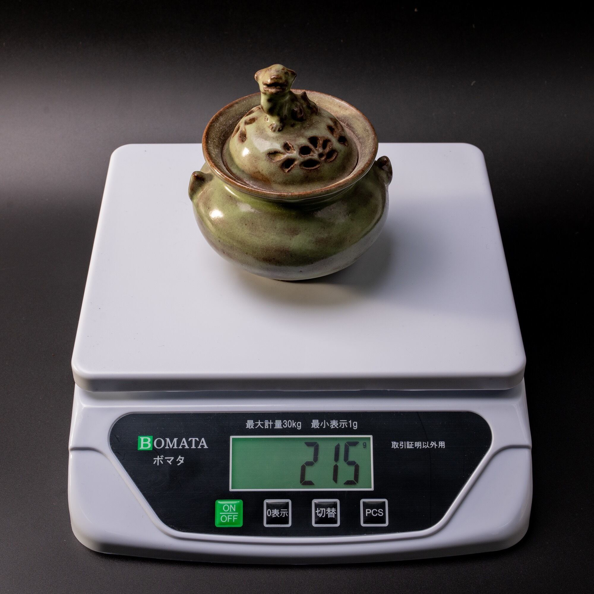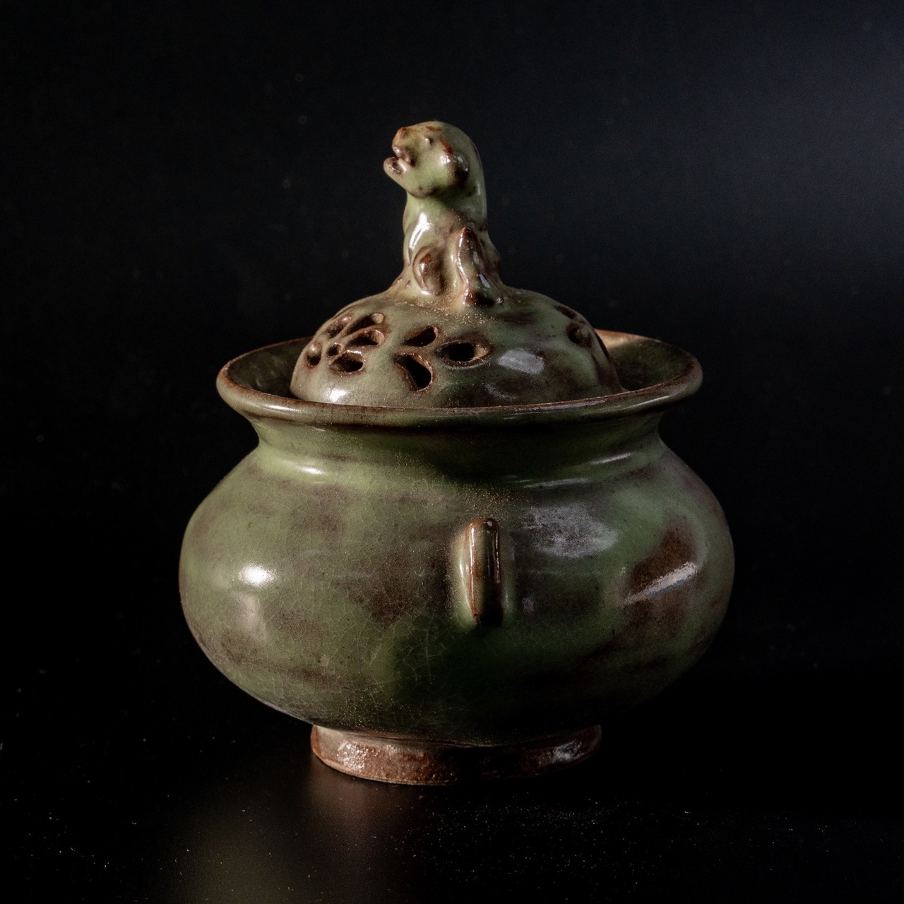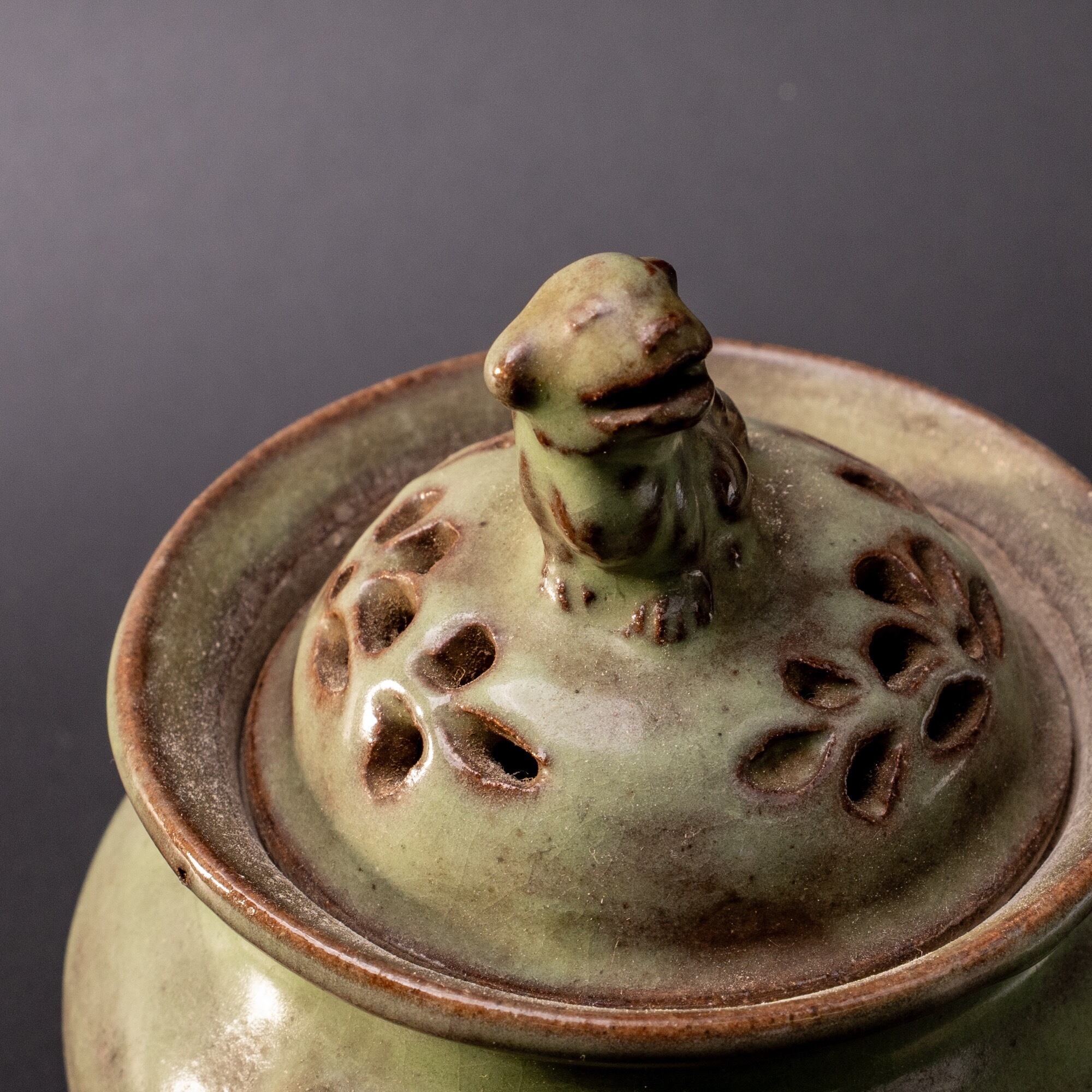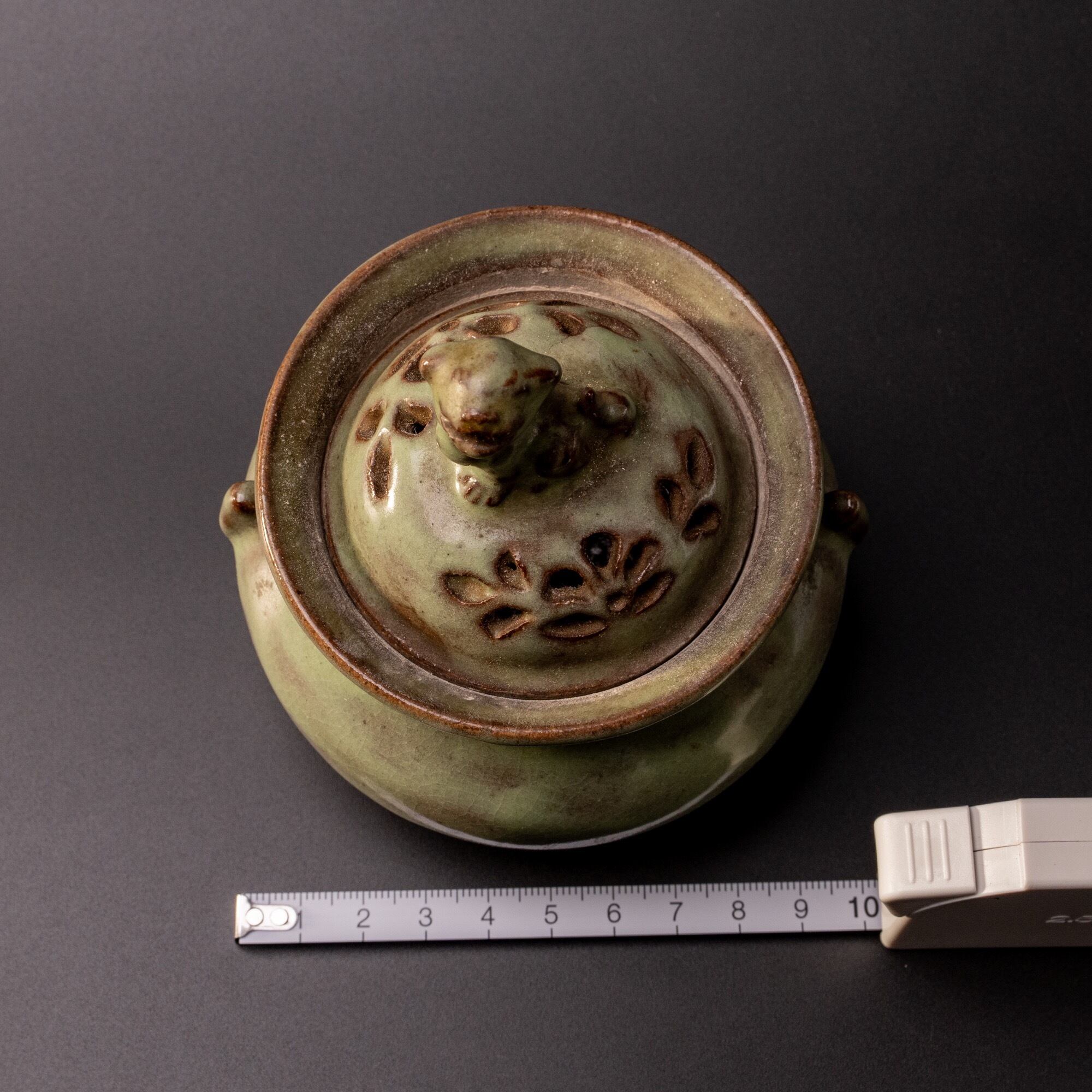 こちらは、落ち着いた緑釉が美しい「獅子蓋付き香炉」です。